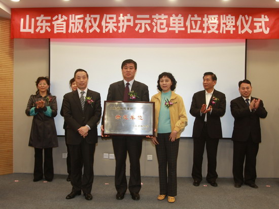 4月22日,山東省版權(quán)保護示范單位授牌儀式在公司研發(fā)中心隆重舉行。山東省版權(quán)局副局長郭愛玲,青島市政府市長助理武鐵軍,市文化市場行政執(zhí)法局黨組書記、局長徐增敏,以及公司有關(guān)領(lǐng)導(dǎo)參加了儀式。