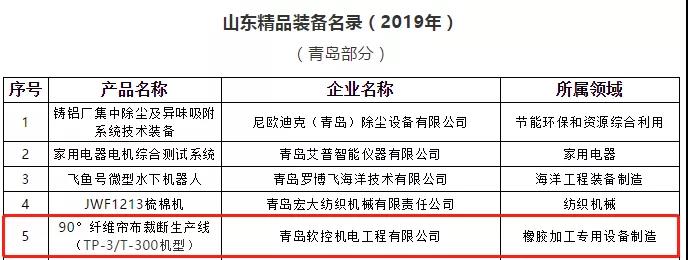 近日,山東省工業(yè)和信息化廳發(fā)布了《山東精品裝備名錄(2019年)》,軟控90°纖維簾布裁斷生產線(TP-3/T-300機型)成功入選“山東精品裝備”行列。